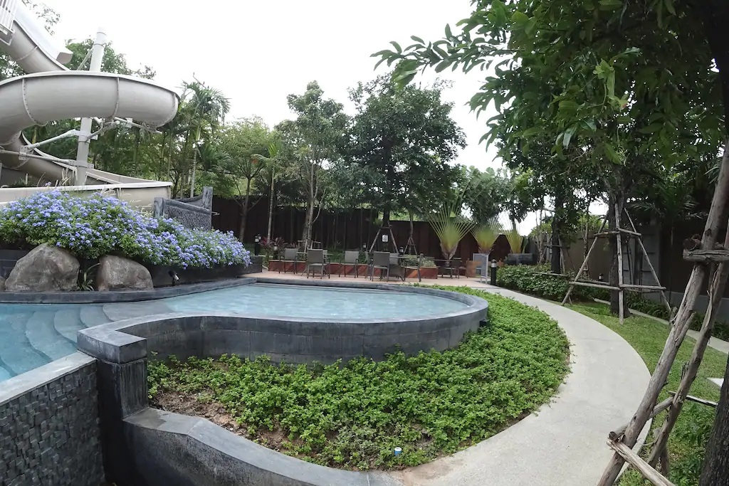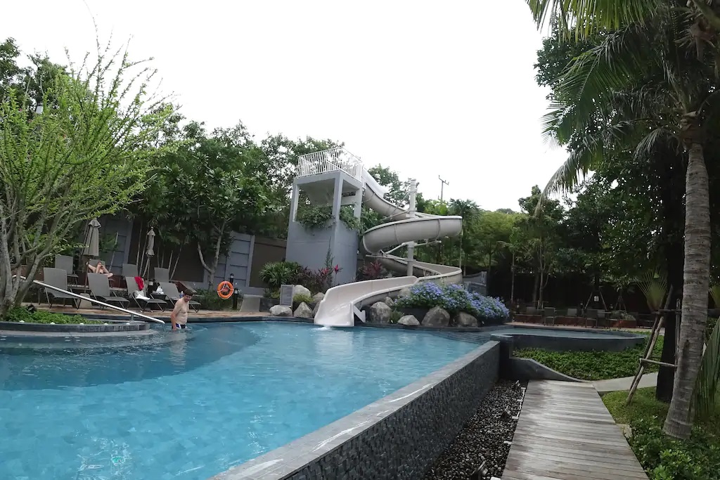 استخر شنا رایگان با سرسره آب و آبشار، سونا رایگان و امکانات دیگر.