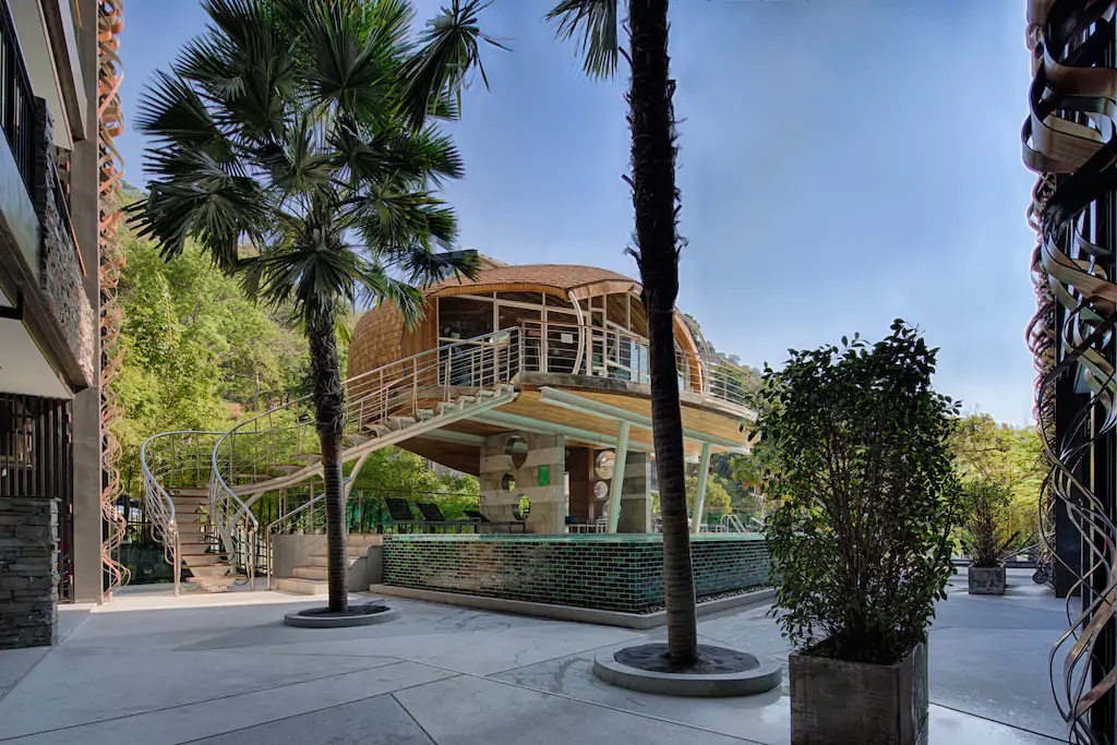 – استخر شنا شگفت انگیز با آفتاب و صندلی و چترهای طبیعتی؛